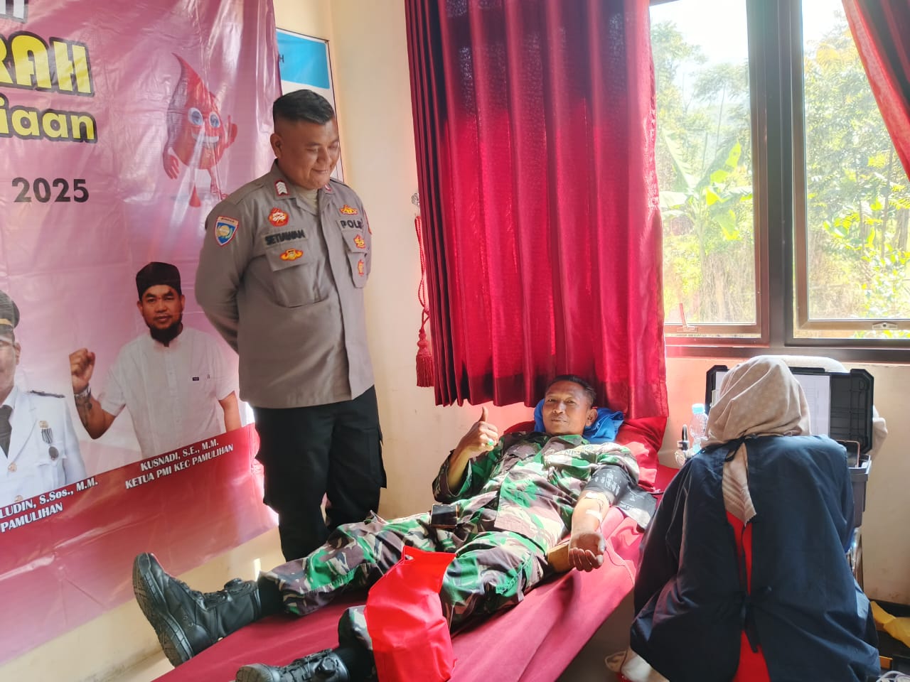 KILASGARUTNEWS.id|Dalam rangka mendukung kegiatan kemanusiaan, Bhabinkamtibmas Polsek Pamulihan Polres Garut, Bripka Setiawan dan Bhabinsa Koramil setempat menghadiri kegiatan Bhakti Sosial Donor Darah yang diselenggarakan di Aula Kantor Kecamatan Pamulihan pada Rabu pagi (30/4/2025).