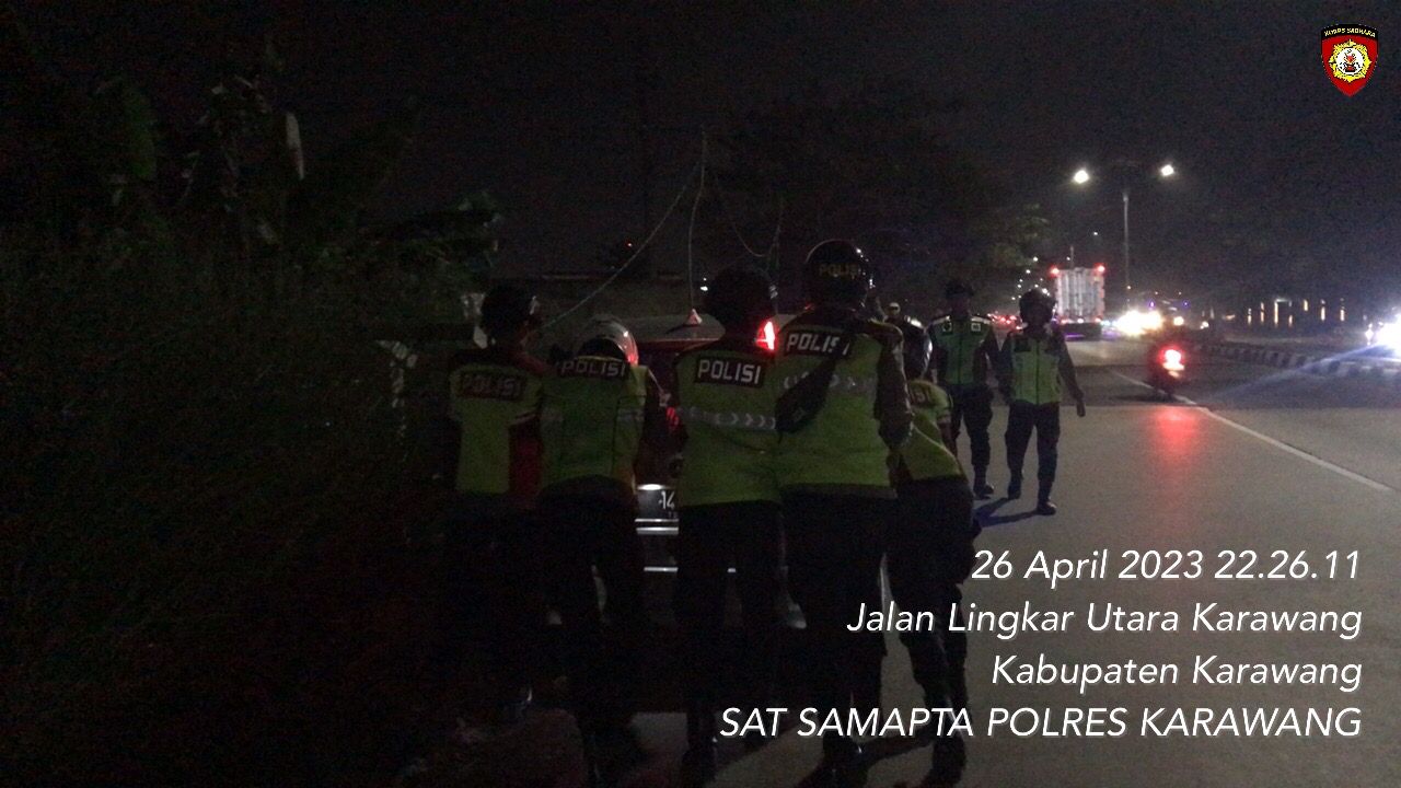 KILASGARUTNEWS.id|Aksi humanis ditunjukkan aparat kepolisian. Personel Samapta Polres Karawang Polda Jabar membantu mendorong mobil pemudik yang mengalami mogok di bahu jalan. berlokasi di jalan lingkar utara Kabupaten Karawang pada Rabu malam ( 26/04/2023 ) sekira pukul 22.30 Wib