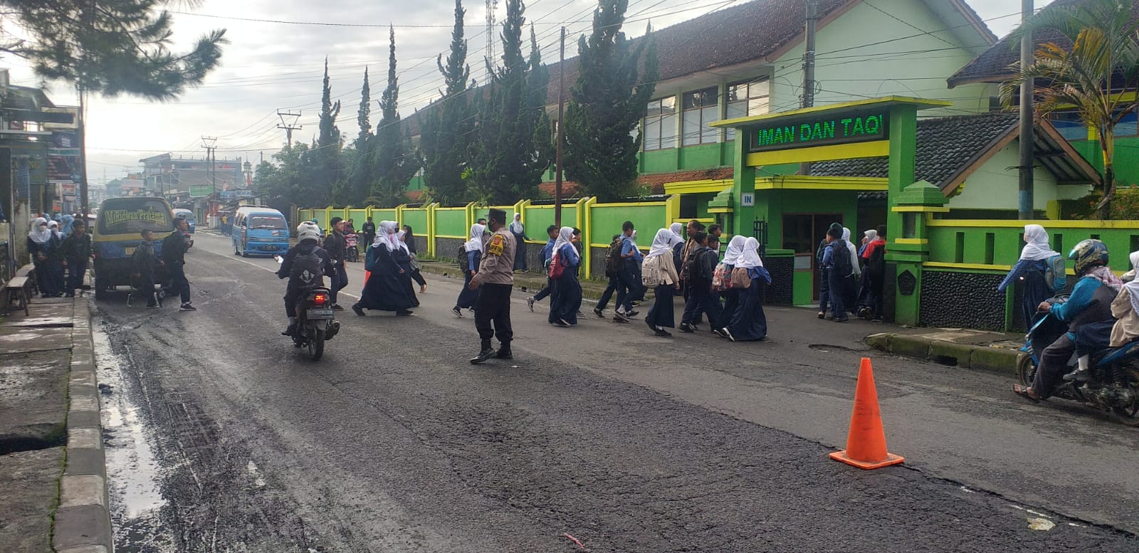 KILASGARUTNEWS.id|Polsek Cikajang Polres Garut melakukan pengaturan lalu lintas jam rawan pagi yang berlokasi di SMP Negeri 1 Cikajang Kabupaten Garut pada hari Kamis (01/12/2022) pukul 06.30 WIB sampai dengan selesai.