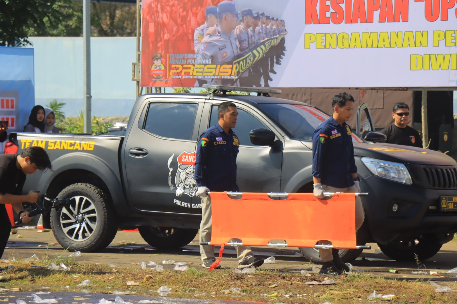 Turut hadir Kapolres Garut AKBP Mochamad Fajar Gemilang, S.I.K., M.H., M.I.K., PJ Bupati Garut Drs. H. Barnas Adjidin, M.M., MMPD., Dandim 0611 Garut Letkol CZI Dhanisworo, S.Sos, Dandenpom III/2 Garut Letkol (K) Wiana Warsanah, S.H., bersama unsur Forkopimda Garut, PJU Polres Garut serta perwakilan pimpinan dari masing-masing instansi terkait.