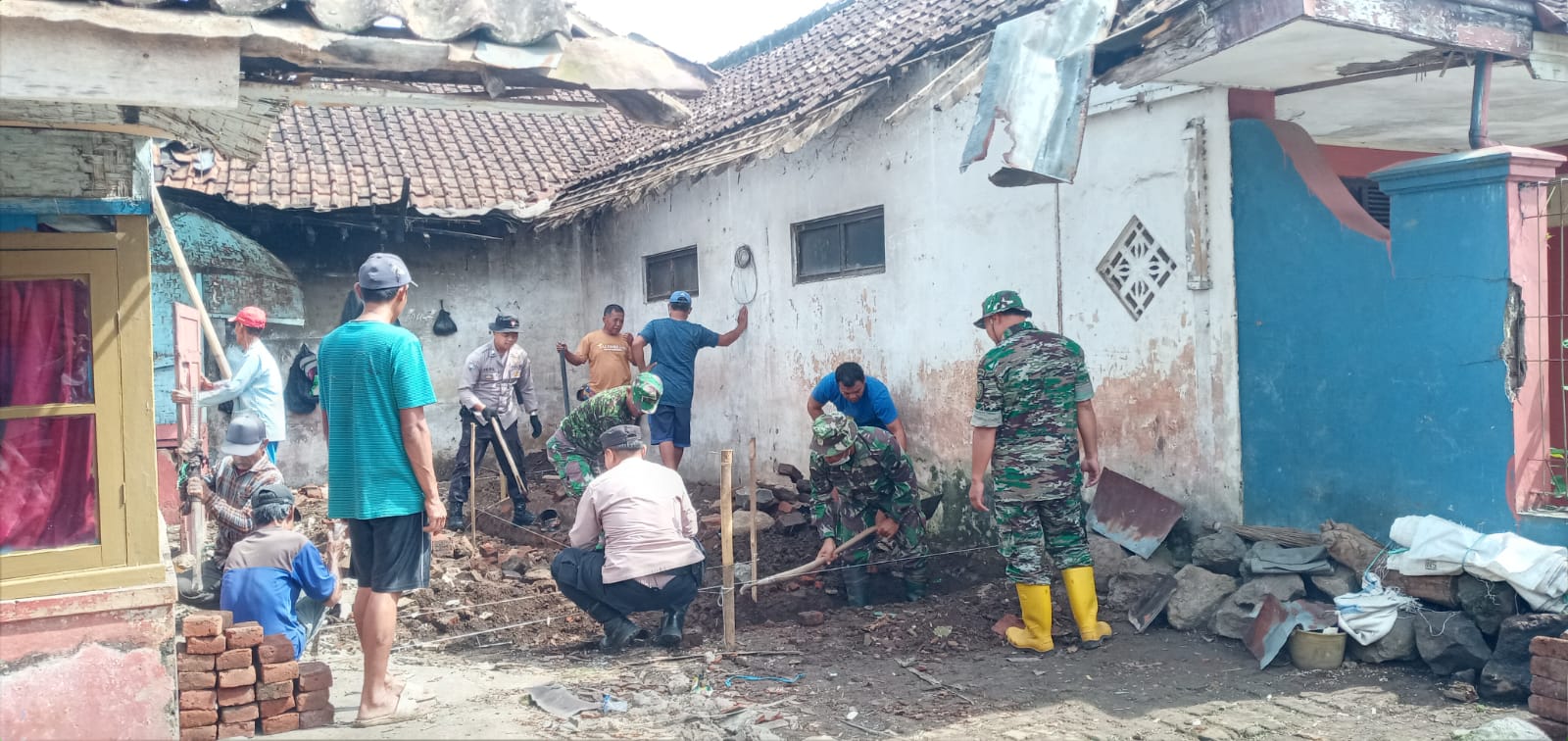 Bhabinkamtibmas Desa Jatisari Brigadir Risal Nurhasan, SH dan babinsa melaksanakan gotong royong pembongkaran dan pembangunan rumah bantuan akibat bencana alam Hidrometeorologi.