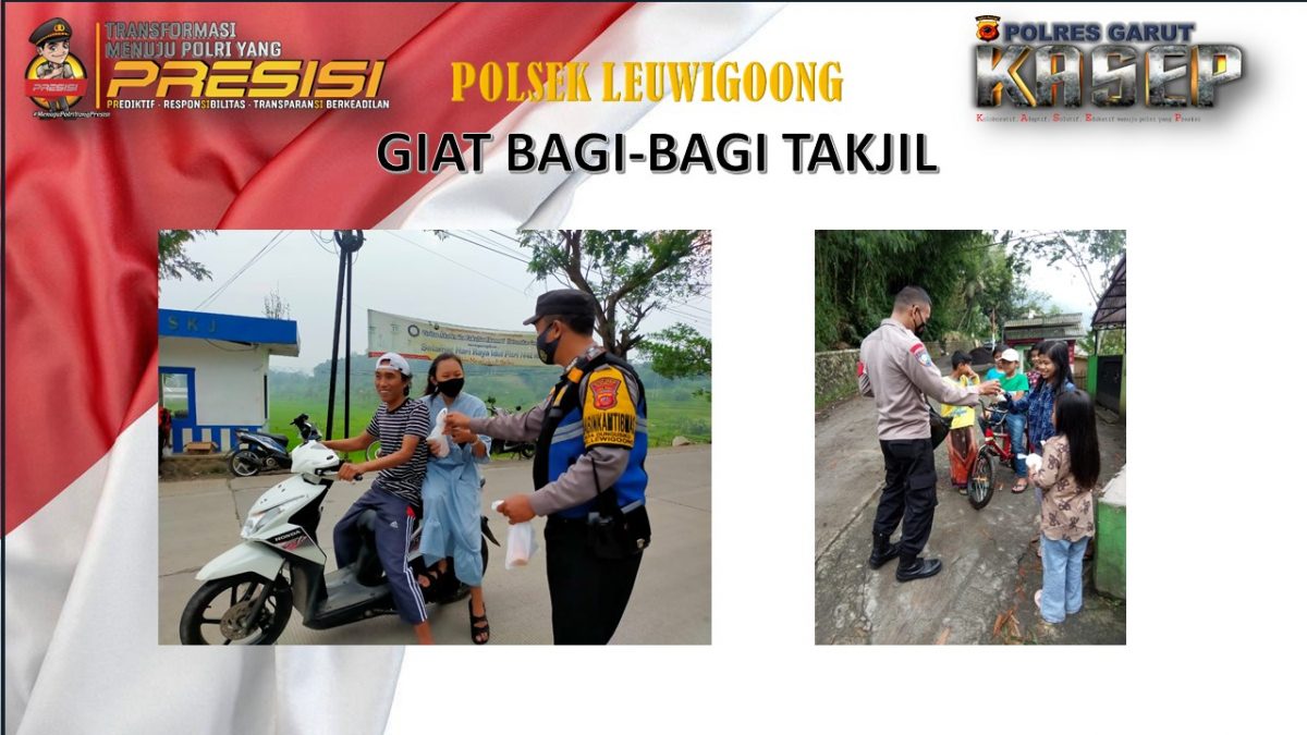 Kapolsek leuwigoong Ipda Tatang meminta agar warga setempat untuk memelihara dan menjaga toleransi di bulan Ramadhan, melalui kegiatan pembagian takjil ini diharapkan dapat mempererat silahturahmi antar sesama warga dengan tetap berpedoman protokol kesehatan pada saat pembagian takjil guna mencegah penyebaran Covid-19.