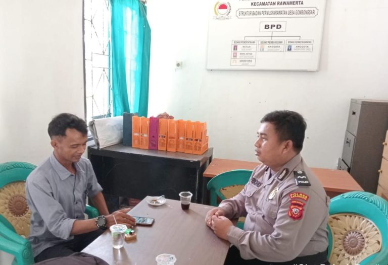 Bhabinkamtibmas Polsek Rawamerta Polres Karawang Aipda Supriono menyambangi BPD di kantor desa binaannya, dan diterima langsung anggota BPD Karno dan anggota BPS di Desa Gombongsari Mansur Kecamatan Rawamerta Kabupaten Karawang, kamis (01/06/2023).