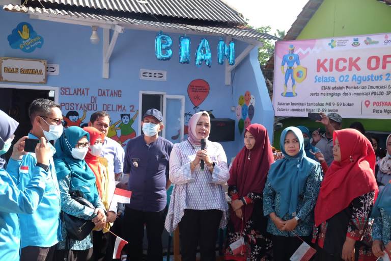Kilas Garut News-Ketua Tim Penggerak Pemberdayaan Kesejahteraan Keluarga (TP PKK) Kabupaten Garut, Diah Kurniasari meninjau Pelaksanaan Bulan Imunisasi Anak Nasional (BIAN) yang dilaksanakan di Posyandu Delima 2, Desa Ngamplangsari, Kecamatan Cilawu, Kabupaten Garut, Selasa (2/8/2022).