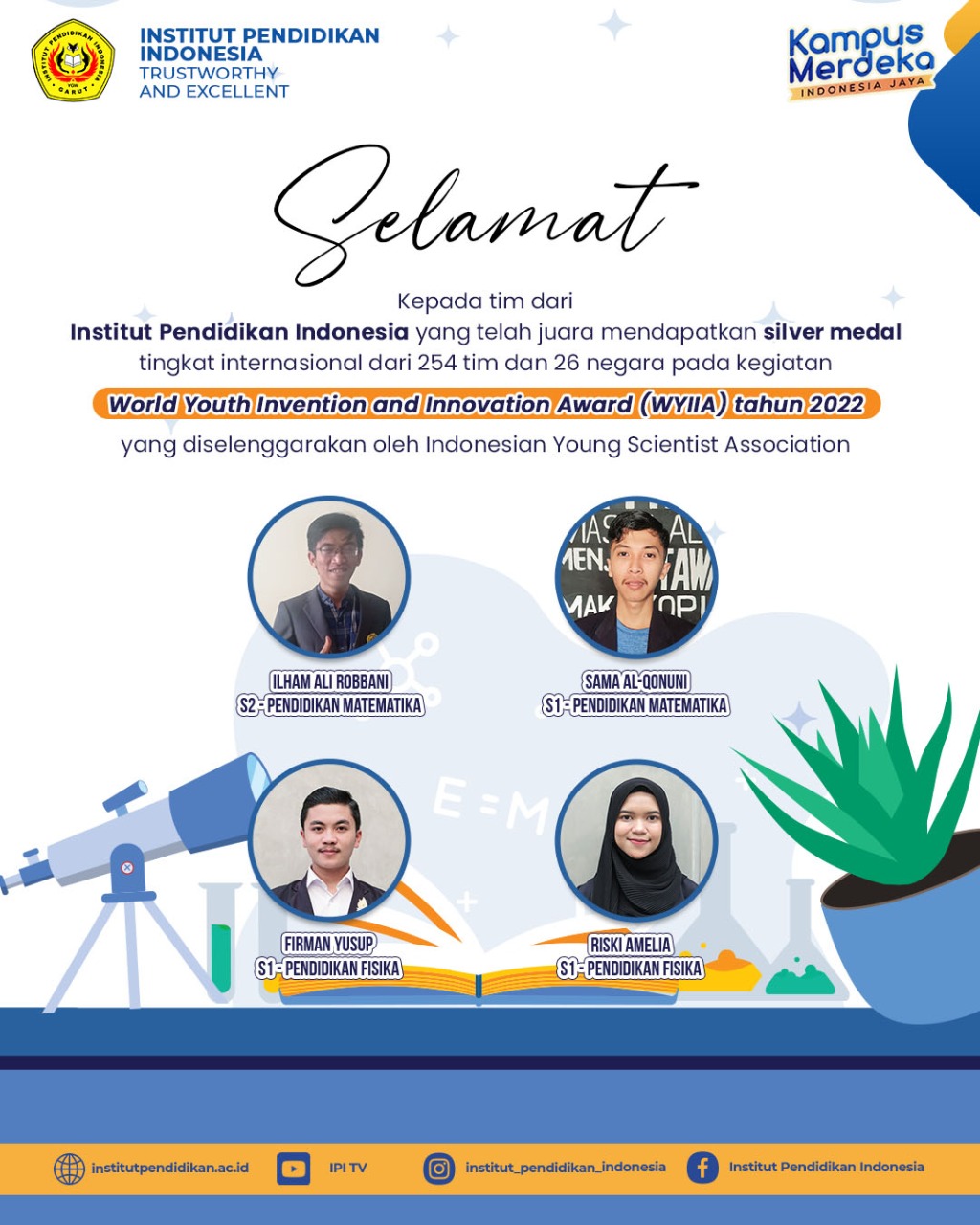 Kilas Garut News- Salah satu Mahasiswa S1 dan S2 dari Institut Pendidikan Indonesia (IPI) Garut diundang oleh President Indonesian Young Scientist Assocation dalam kegiatan World Youth Invention and Innovation Award (WYIIA) pada tanggal 22-26 Agustus 2022 di Yogjakarta.