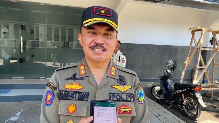 Kasatpol PP Garut Basuki Eko saat gelar apel penertiban APK Kampanye