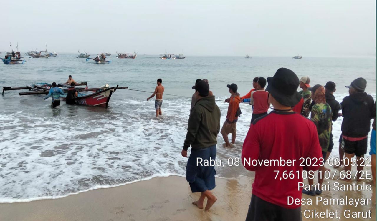KILASGARUTNEWS.id|Sat Polairud Polres Garut bersama nelayan sekitar membantu evakuasi perahu sekelompok nelayan yang terhantam ombak di Pantai Santolo.