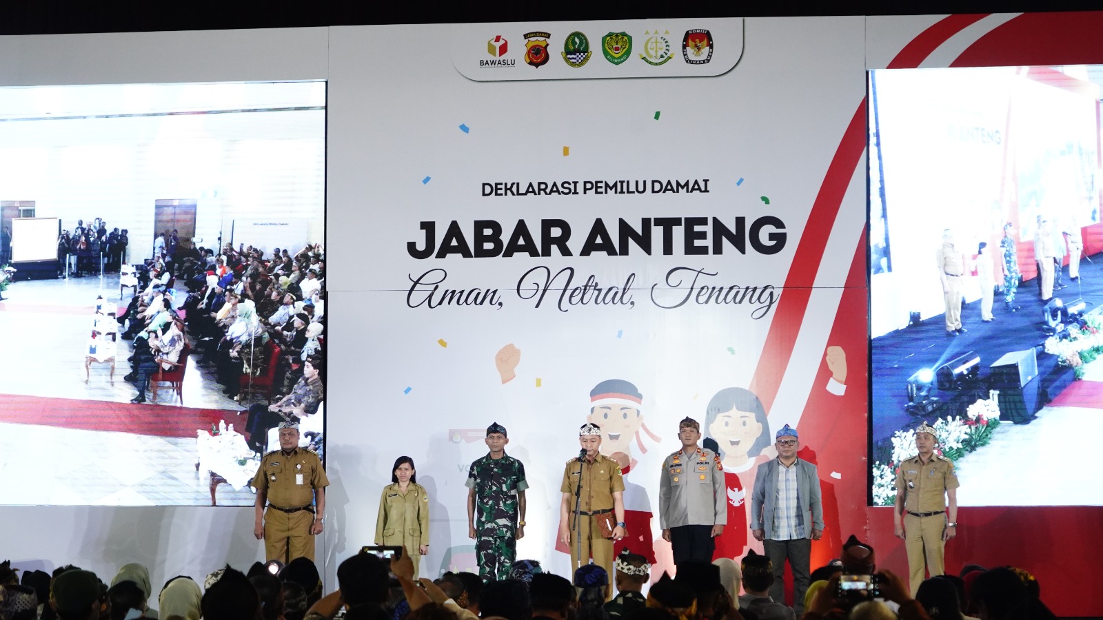 Deklarasi Pemilu Damai dipimpin oleh PJ. Gubernur Jabar dan dihadiri Kapolda Jabar, Kabinda Jabar, Kajati Jabar, Wakil Ketua DPRD Jabar, Ketua KPU Jabar, Ketua Bawaslu Jabar, Kasdam III/Slw, Kasgartap II/Bdg, Wakapolda Jabar, Irdam III/Slw, Kapoksahli Pangdam III/Slw, para Rektor Perguruan Tinggi di Jabar, Danlanal Bandung, para ketua DPD Partai Politik tingkat Jabar, PJ. Walikota Bandung, para Asisten Kasdam III/Slw, Dandim 0618/Kota Bandung, para PJU Polda Jabar, Dansat Brimob, para Perangkat Daerah Prov. Jabar, Para Sekda dan Kakesbangpol Se-Jabar, para tokoh masyarakat Jabar, pimpinan media massa, para pelaku usaha dan perwakilan Camat dan Lurah Se-Jabar.