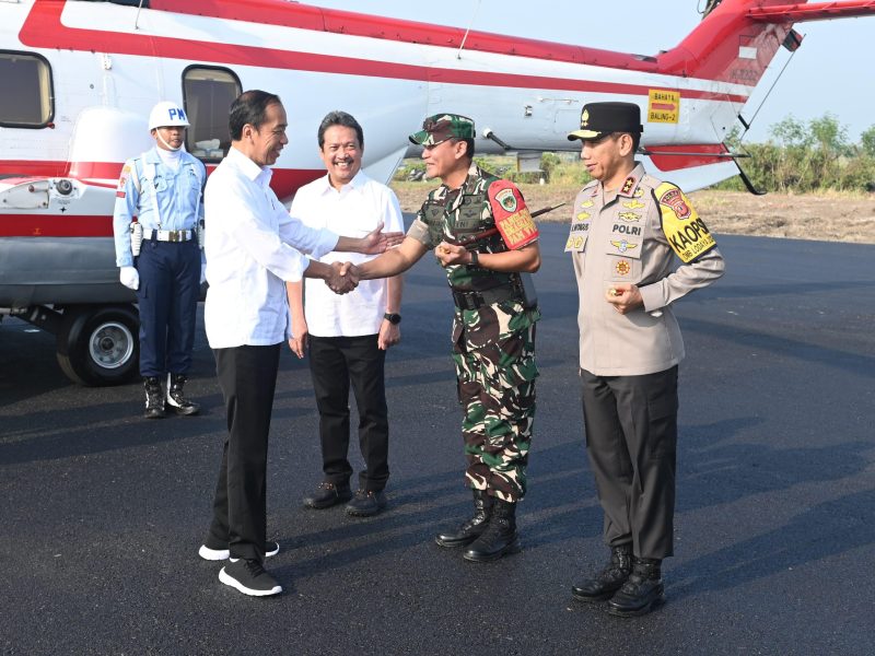 Kedatangan Presiden Joko Widodo di Hellypad Balai Layanan Usaha Produksi Perikanan Budidaya (BLUPPB) Desa Pusakajaya Utara, Kabupaten Karawang, Provinsi Jawa Barat disambut oleh Menteri Kelautan dan Perikanan Wahyu Sakti Trenggono, Pangdam III/Slw dan Kapolda Jabar.