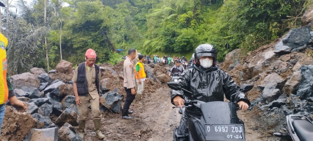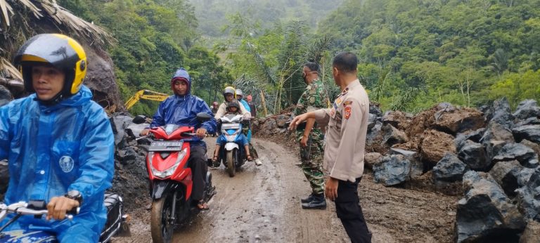 KILASGARUTNEWS.id|Polsek Talegong Polres Garut kembali lakukan pengaturan arus lalu lintas dan pengamanan pembersihan material longsor di hari ke-4. Jumat (14/4/23).