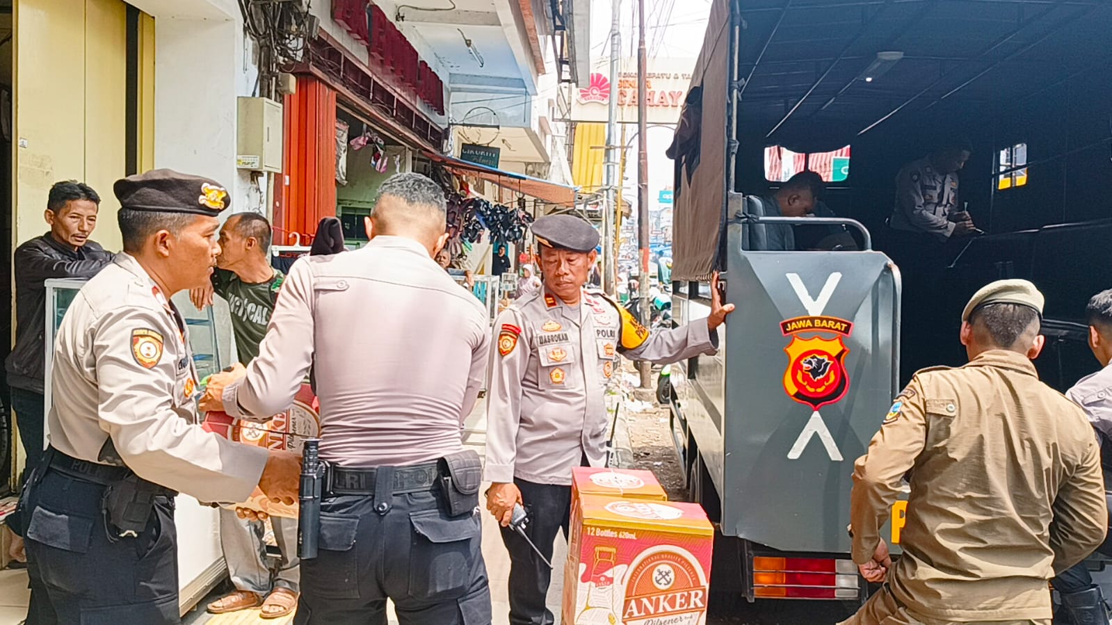 Bersama dengan Sat Pol PP Kabupaten Garut di lakukan pemeriksaan pada truk Box tersebut, dan di temukan ribuan botol Miras berbagai merk.