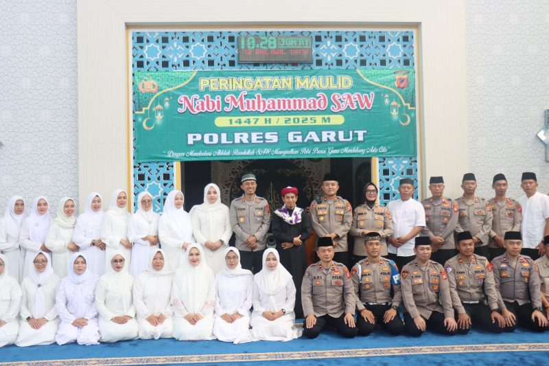 KILASGARUTNEWS.id|Polres Garut menyelenggarakan peringatan Maulid Nabi Muhammad SAW 1447 H sebagai bagian dari program pembinaan terpadu di lingkungan jajaran Polres Garut. Acara yang berlangsung di Masjid Nurul Hakim Mapolres Garut ini dihadiri oleh Kapolres Garut AKBP Yugi Bayu Hendarto beserta Ibu Ketua Bhayangkari Cabang Garut Ny. Intan Yugi, serta para pejabat utama, perwira, bintara, dan ASN. Jumat (5/9/2025).