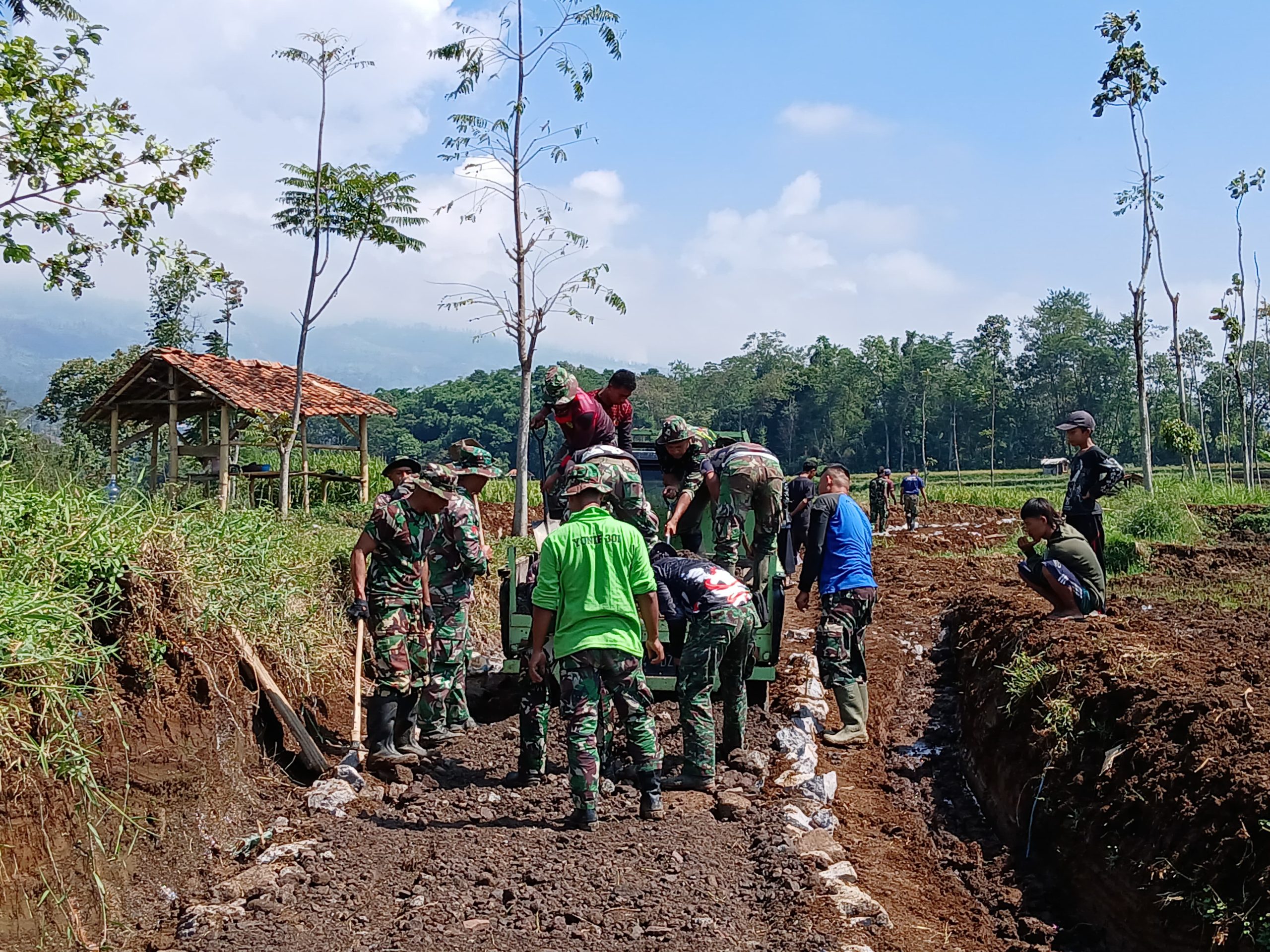 KILASGARUTNEWS.id|Program TNI Manunggal Membangun Desa (TMMD) ke 120 TA 2024 Kodim 0611/Garut yang dilaksanakan di Desa Cinta Damai, Kecamatan Sukaresmi, Garut, Jawa Barat, tak terasa sudah hampir 2 pekan. Kini para personel fokus pada pembangunan jalan penghubung dengan melakukan pengerasan jalan yang menghubungkan Kampung Pasir Pari dan Kampung Paku Haji.