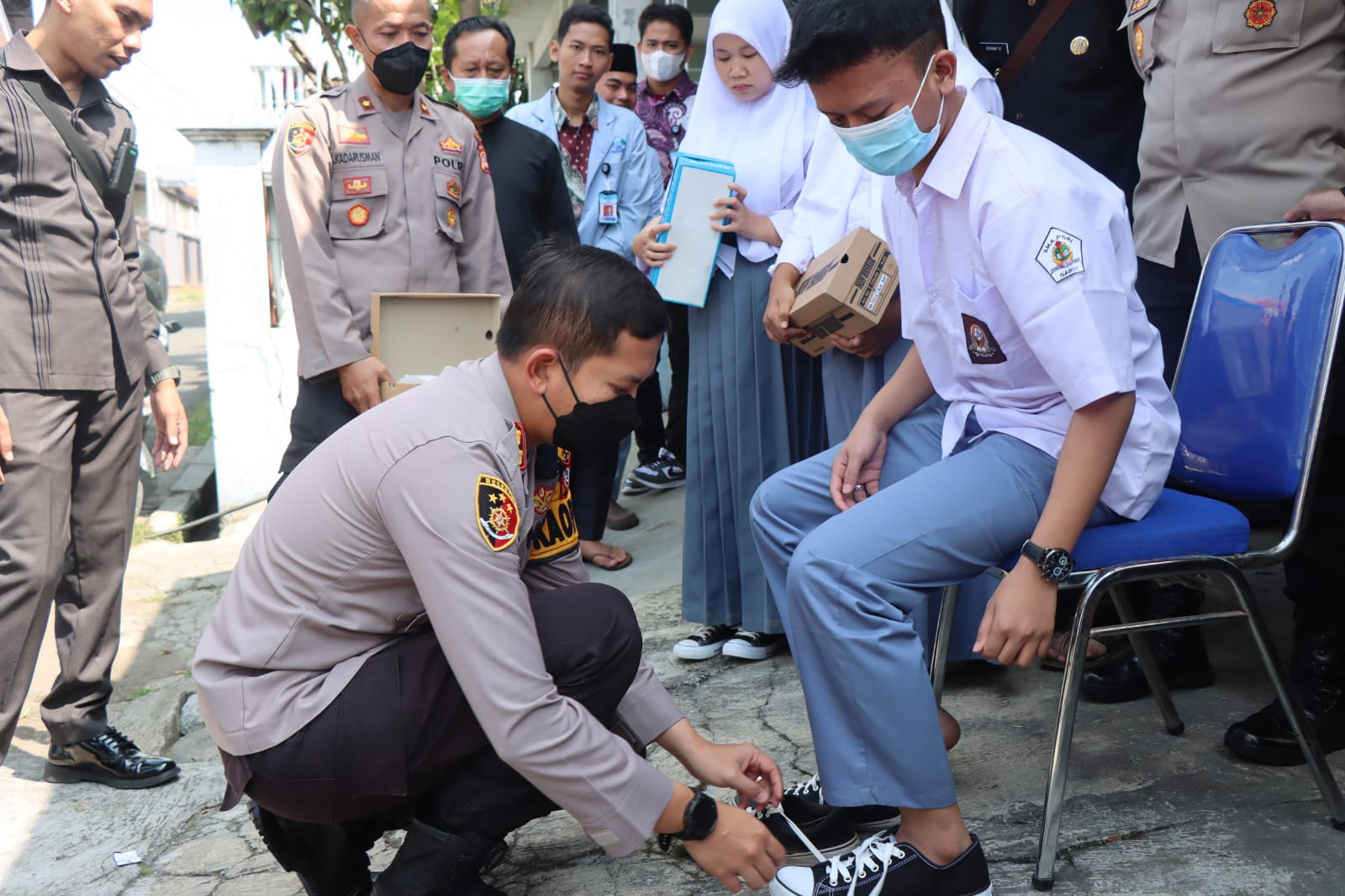 Kilas Garut News-Kapolres Garut AKBP Wirdhanto Hadicaksono. S.I.K., M.Si atas nama Kapolda Jabar melaksanakan bakti sosial, berbagai sepatu kepada anak-anak sekolah korban bencana alam banjir di wilayah kabupaten Garut.