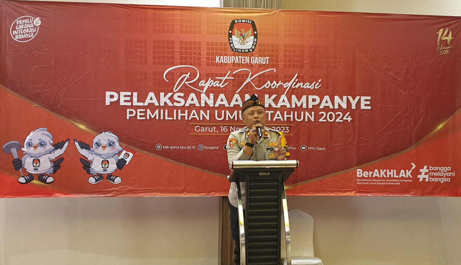 Kapolres Garut AKBP Rohman Yonky Dilatha, S.I.K, M.Si, melalui Kabag Ops Polres Garut Kompol Syaifudin Hamzah, M.Pd, menyampaikan paparan materi dan strategi Polres Garut dalam rangka pengamanan Kampanye Pemilu tahun 2024.