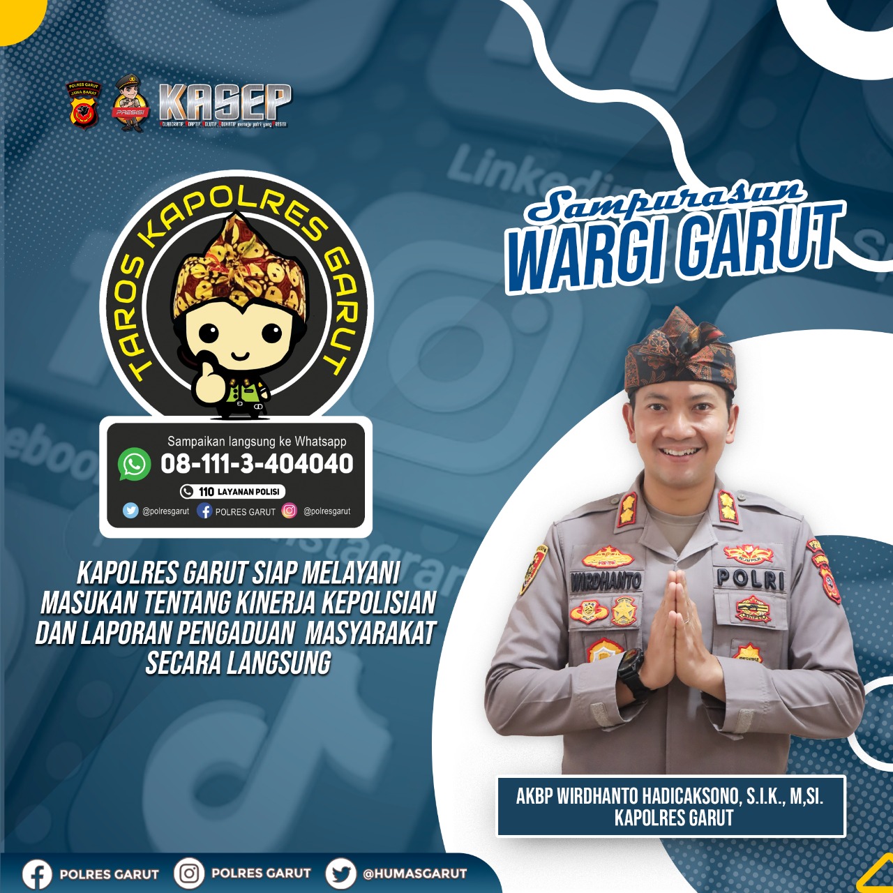 “Untuk prosedur program Taros Kapolres Garut silahkan rekan-rekan dapat menyebarkan nomor seluler yang terkait dengan aplikasi Whats App dengan nomor 081113404040 , itu merupakan nomor saya pribadi dan Insyaallah saya akan merespon secepat mungkin untuk memudahkan keluhan maupun aduan dari masyarakat Kab.Garut yang membutuhkan bantuan dari Polres Garut.”Tutup Kapolres Garut.(Deden Kurnia).