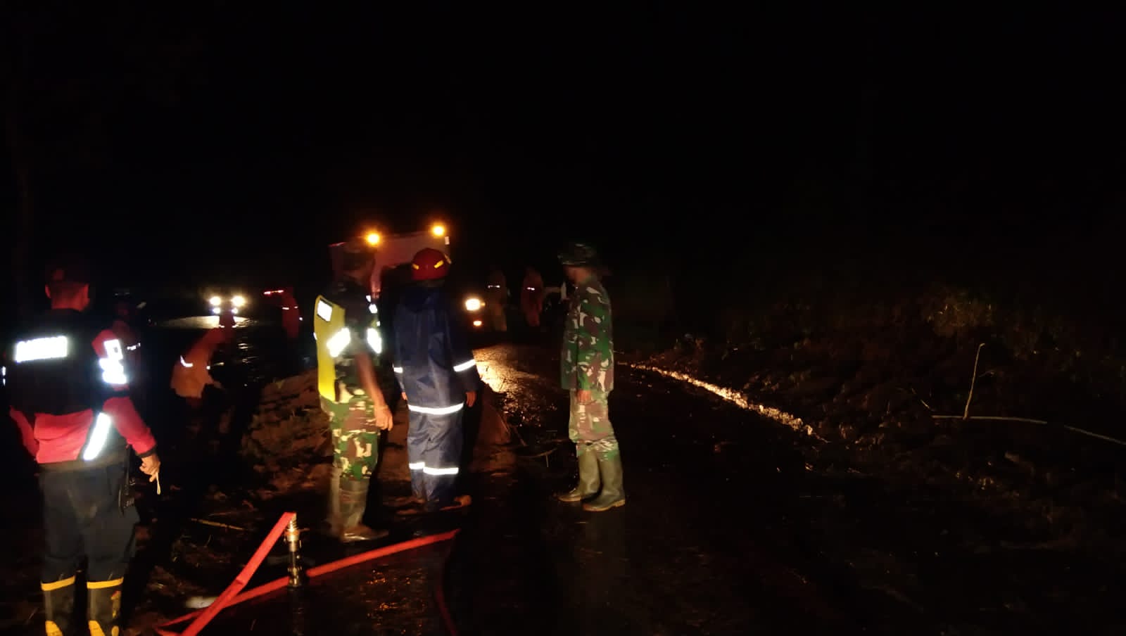 Kapolsek bersama Bhabinkamtibmas, Koramil dan Dinas Pemadam Kebakaran serta masyarakat sekitar bekerja sama membersihan material tanah longsor tersebut sehingga arus lalu lintas dapat berjalan dengan cara buka tutup.