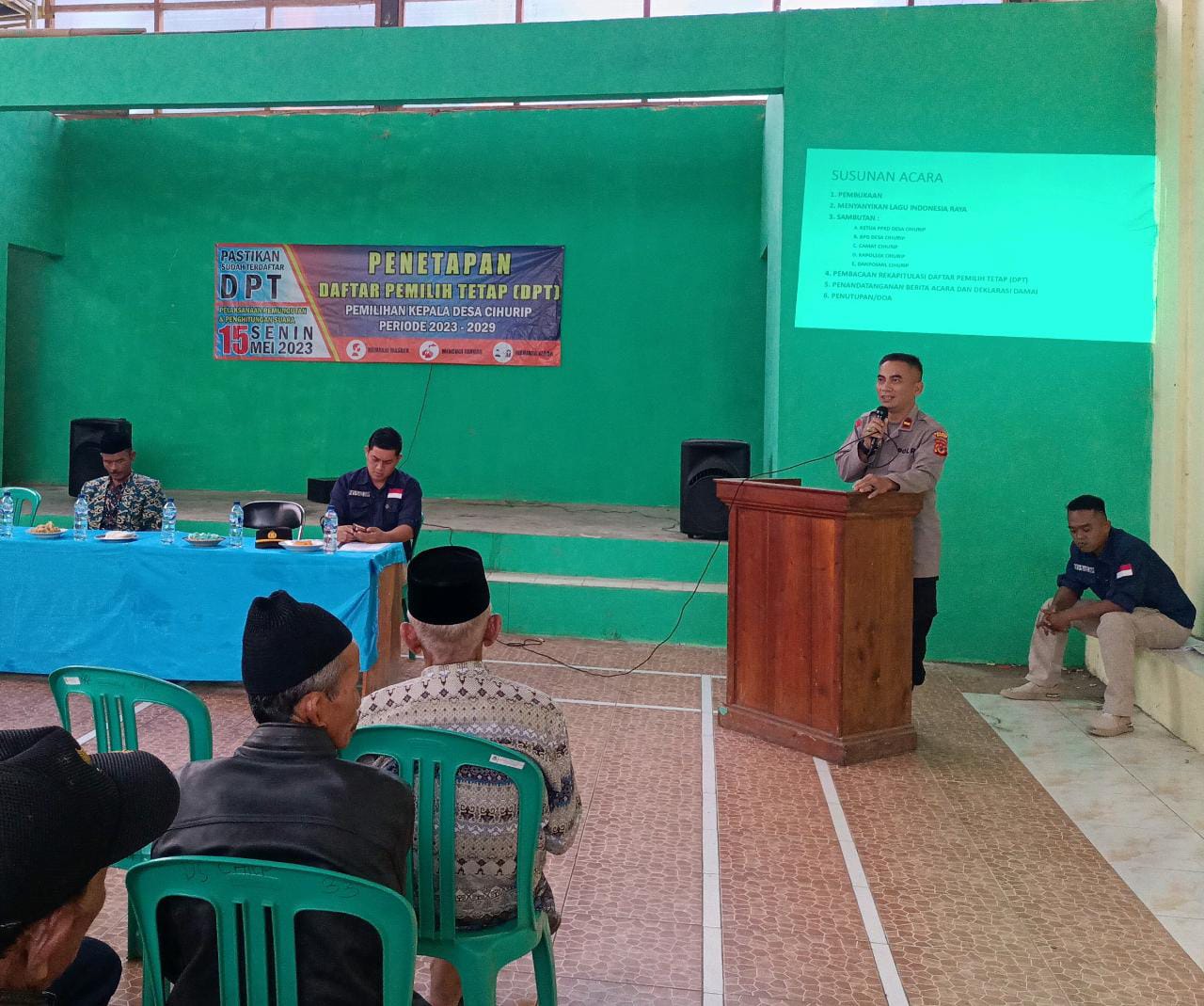 Sesuai arahan Kapolres Garut AKBP Rio Wahyu Anggoro kepada Polsek Jajaran untuk memonitoring dan amankan segala kegiatan menjelang Pilkades. Hal ini disampaikan oleh Kapolsek Cihurip Ipda Samsul Arifin dalam menghadiri kegiatan tersebut.