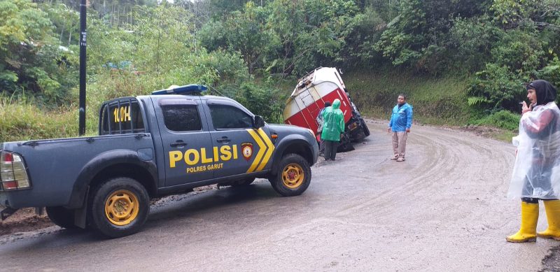” Iya benar, Truk Tangki bermuatan Minyak Sawit mentah Perjalanan dari arah Cikajang berpapasan dengan Mobil jenis truk juga, sehingga jalan semakin sempit, tanpa di sadari ban belakang truk tanki tersebut terperosok di tikungan sebelah kiri Jalan kemudian mobil truk tengki tersebut menutup setengah badan jalan, Kondisi pada saat kejadian malam hari sekira Pukul 23.00 WIB dan cuaca lagi Hujan deras.”, ungkap Kapolsek Cikajang Iptu Sularto (doc Humas Polres Garut).