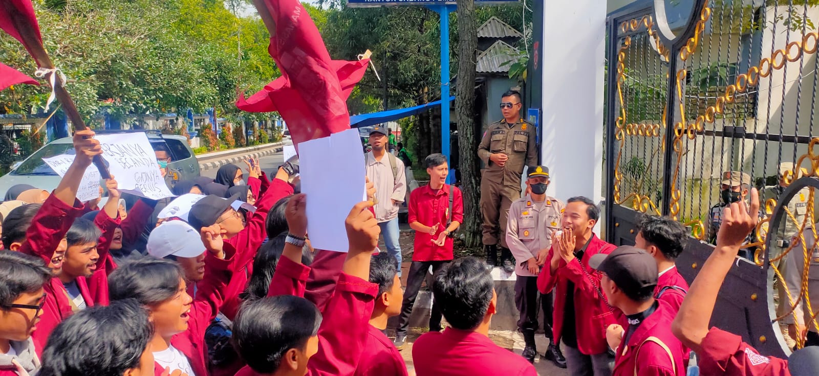 Selanjutnya, pada pukul 10.10 siang di Aula Rapat BPKAD Kabupaten Garut, massa aksi diterima melaksanakan Audiensi oleh Kepala BPKAD Kab. Garut Drs. H. Zat Zat Munazat, M.Si. dengan dihadiri Kabid Aset BPKAD Kabupaten Garut, Kasat Samapta Polres Garut AKP Yudiono, S.Sos., KBO Sat Intelkam Polres Garut Iptu Wawan Hernawan, S.IP., dan Kapolsek Garut Kota AKP Cucu Wijaya.