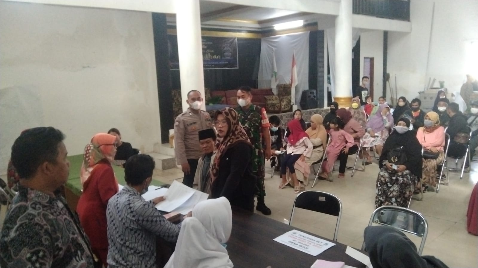 Kilas Garut News-Anggota Polsek Karangpawitan Polres Garut melalui Bhabinkamtibmas Desa Suci hadir dilokasi saat penyaluran Bantuan Langsung Tunai (BLT) yang bertempat di Aula Desa Suci yang bersumber dari dana alokasi Dana Desa (DD) Desa Suci Kecamatan Karangpawitan.Jum’at 22 April 2022.