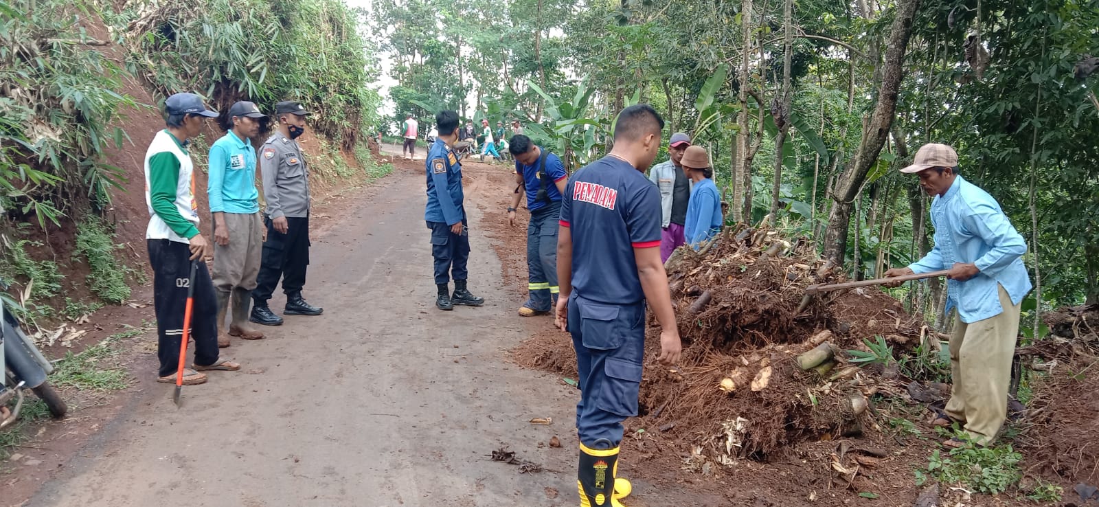 Dari pagi hari sekitar pukul 07.30 Wib warga dari kedua desa mulai berdatangan ke tempat longsoran tanah dan bersama sama bergotong royong membersihkan longsoran tanah yang menghalangi jalan dibantu dari Bhabimkatibmas dan aparat desa lainya.