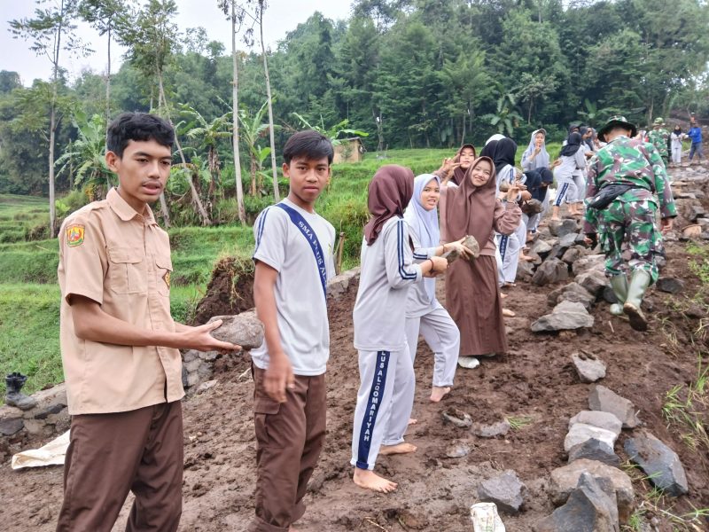 Puluhan siswa itu sengaja datang ke lokasi TMMD untuk membantu, yang dipimpin langsung Kepala Sekolah Dadang Prima Fauji.