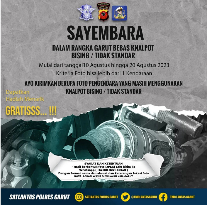 Polres Garut khususnya Satuan Lalu Lintas Polres Garut mengajak warga Kabupaten Garut untuk turut ikut serta berpartisipasi memberantas knalpot bising atau knalpot tidak standar melalui metode sayembara berhadiah.