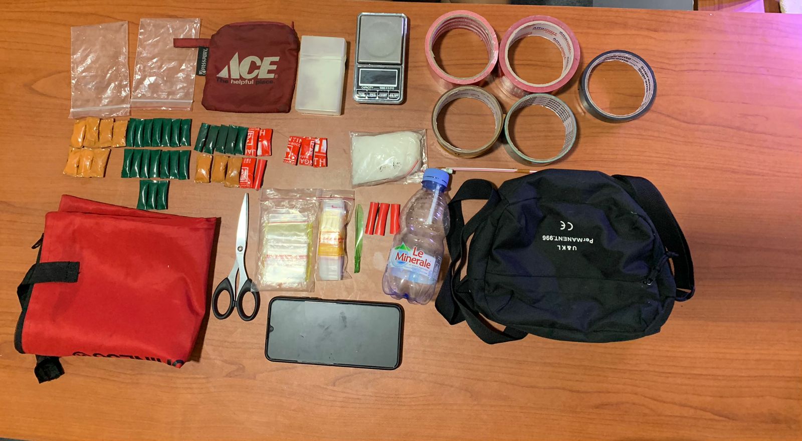 Barang bukti yang diamankan selain pil psikotropika, juga termasuk tas selendang hitam, gunting, handphone, serta screenshot percakapan WhatsApp yang diduga berkaitan dengan transaksi narkoba.