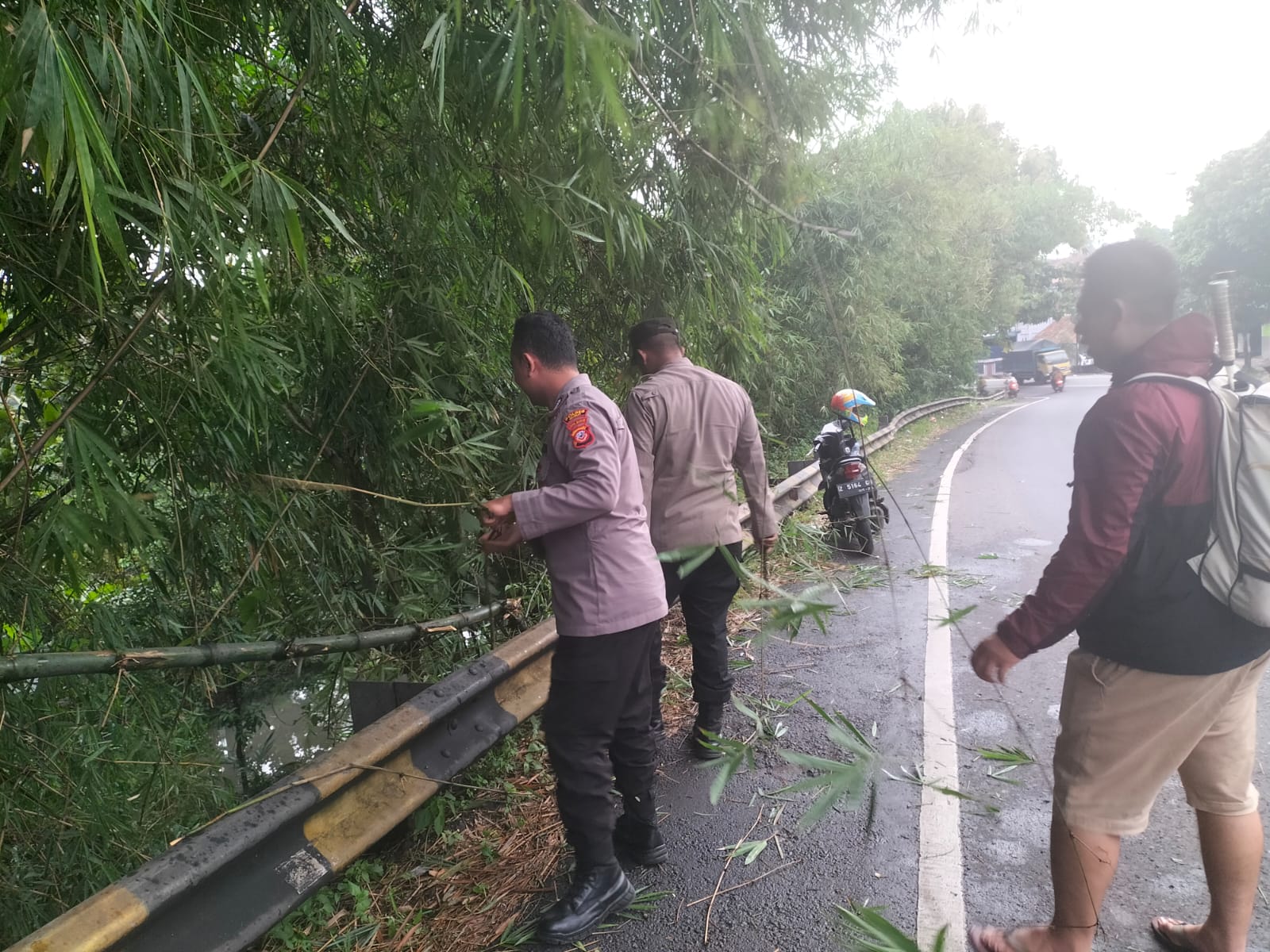“Ya kami melakukan evakuasi pohon bambu tersebut, sembari melakukan buka tutup arus lalu lintas di sekitar lokasi. Jika dibiarkan material pohon bambu tersebut akan menghambat arus lalu lintas di sekitar lokasi dan sudah tugas kami memberikan pelayanan dan kenyamanan bagi masyarakat atau pengguna jalan lainnya.” Pungkas Wasino.