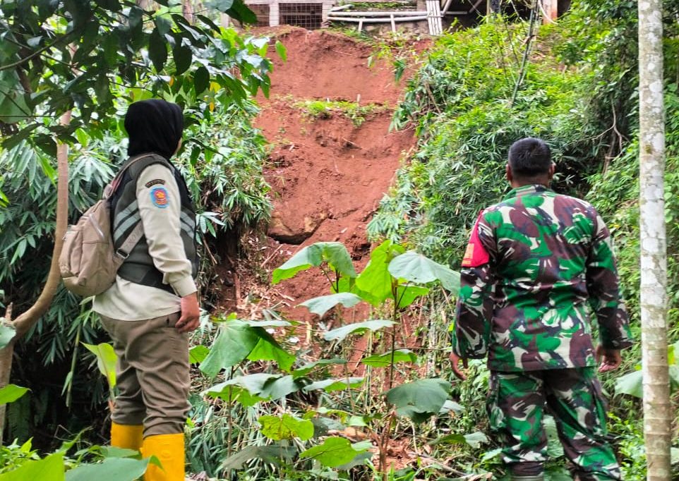 KILASGARUTNEWS.id|Kopda Agus Nandang Babinsa anggota Koramil 1106/Malangbong Kodim 0611/Grt melaksanakan pengecekan langsung ke lokasi tanah longsor yang terjadi di belakang…
