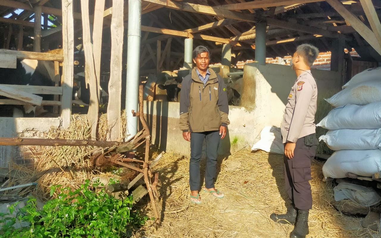 Kilas Garut News-Bhabinkamtibmas Brigadir Risal Nurhasan dari jajaran Polsek Karangpawitan Polres Garut sambangi peternak untuk mengantisipasi penyebaran PMK (Penyakit Muliut…