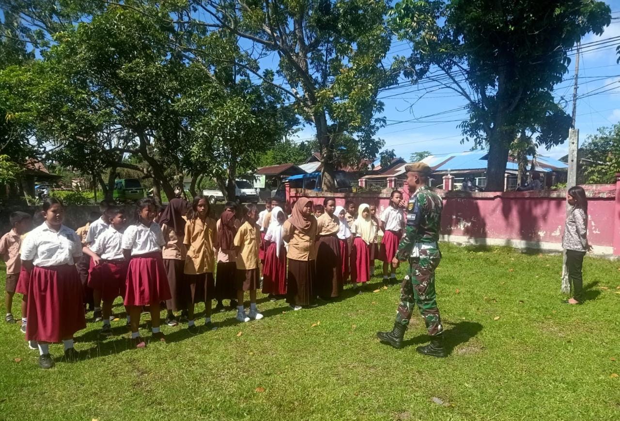 KILASGARUTNEWS.id|Menanamkan disiplin sejak dini kepada anak sekolah, Satgas Yonarhanud 3/YBY melatih keterampilan dasar Peraturan Baris Berbaris (PBB) di SD Inpres 1 Bertingkat Tobelo.