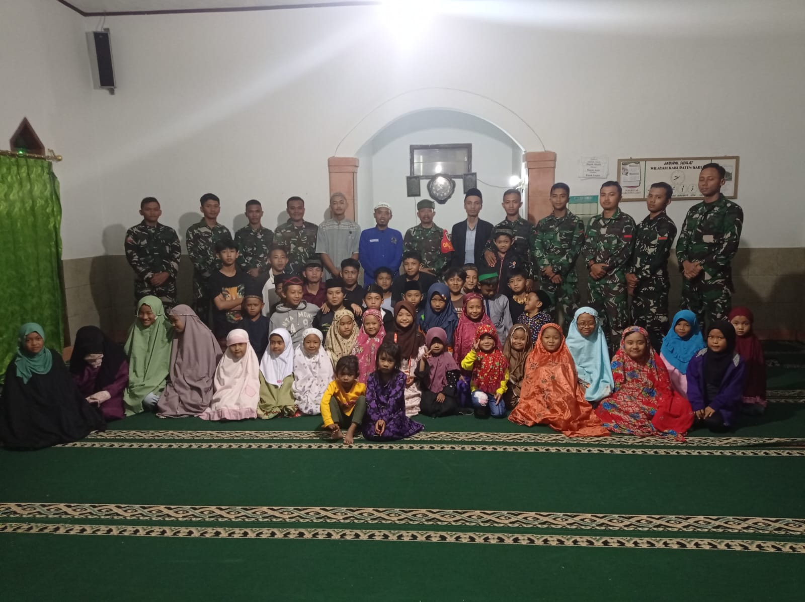 KILASGARUTNEWS.id|Personil Satgas TNI Manunggal Membangun Desa (TMMD) ke 120 Kodim 0611/Garut melaksanakan yasinan bersama anak-anak di Kampung Buleud, Desa Cinta Damai, Kecamatan Sukaresmi, Garut, Jawa Barat, di masjid Jami Nurul Alamin, Kamis malam (16/5/2024).