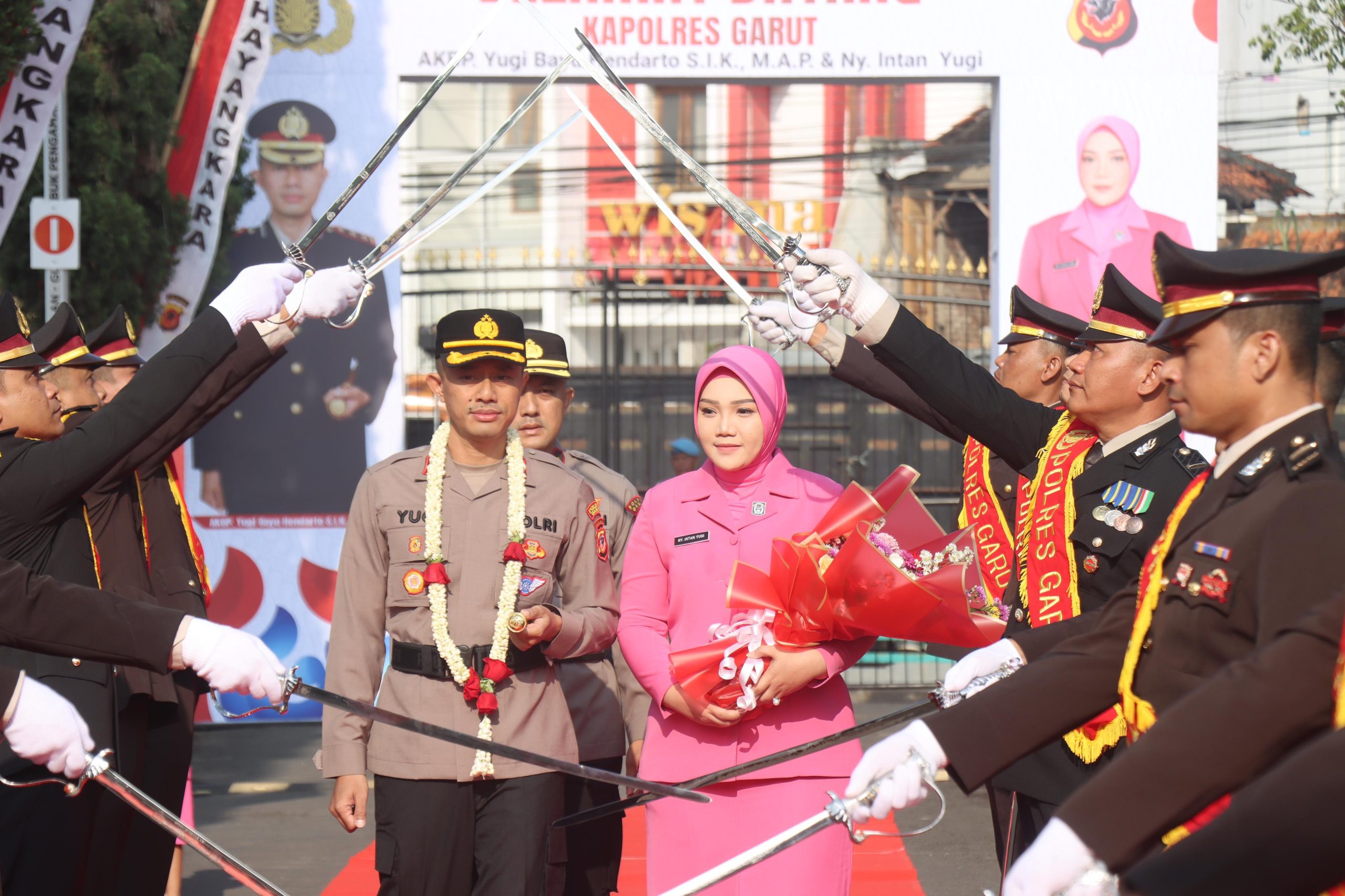 Kapolres Garut AKBP Yugi Bayu Hendarto , S.I.K., M.A.P., beserta Ny.Intan Yugi di sambut dengan rangkaian kegiatan jajar hormat , pedang pora , pertunjukan seni budaya sunda dan pengenalan seluruh perwira dan personel Polres Garut.