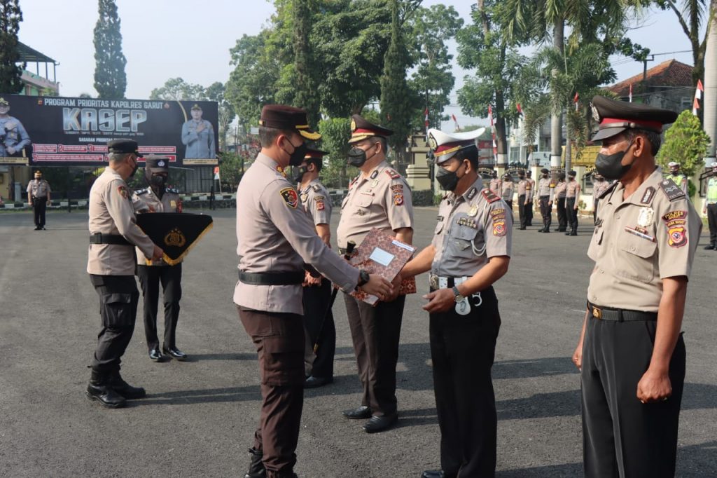 Kapolres Garut AKBP Wirdhanto Hadicaksono dalam sambutannya menyampaikan, pada hari ini kita dapat berkumpul bersama pada upacara korps raport kenaikan pangkat pengabdian serta pemberian penghargaan kepada anggota Polri dan ASN yang memasuki Masa Purna Tugas, dalam keadaan tertib dan khidmat.